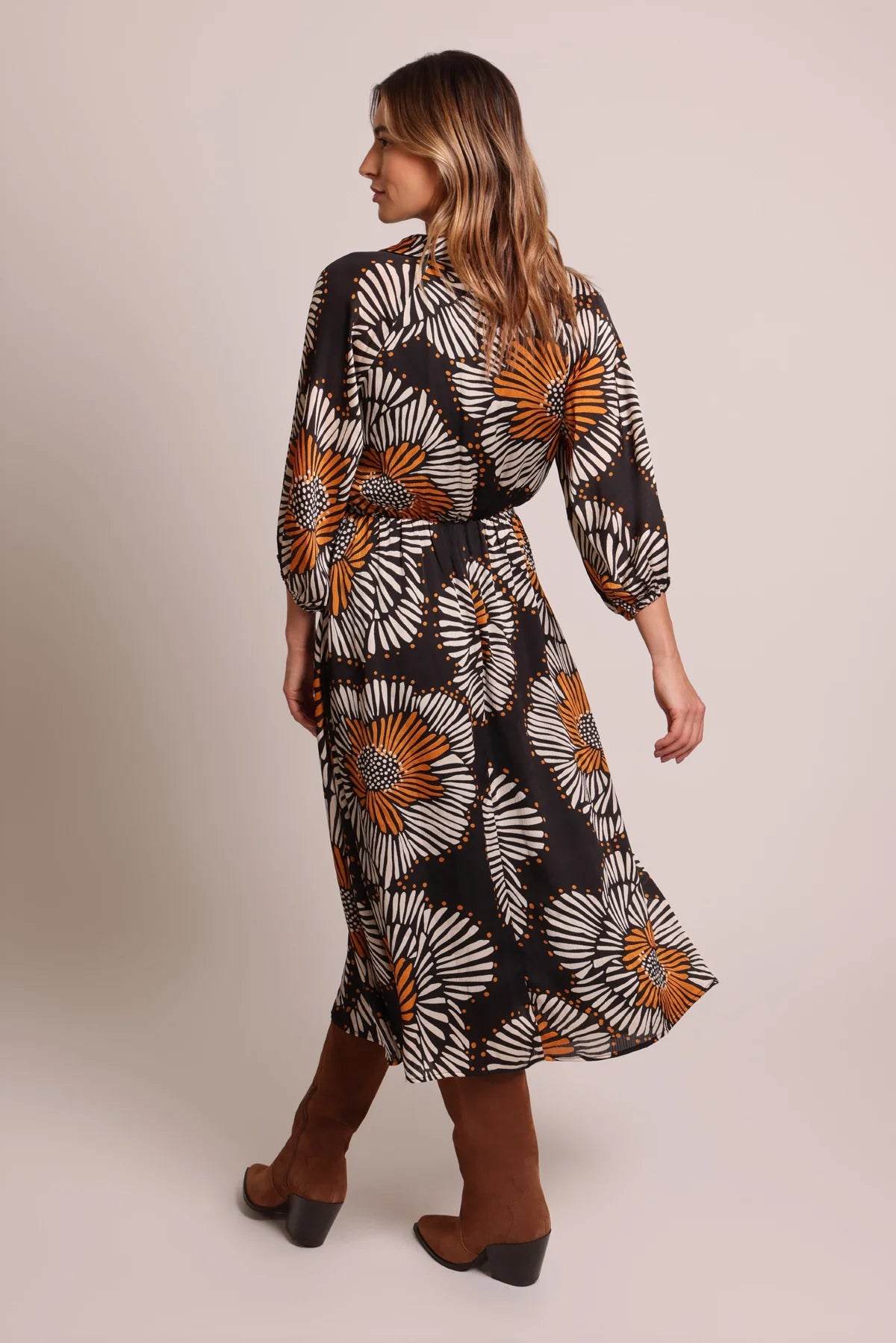 The Fusion dress is a simple midi dress with a classic V-neck shirt collar and an elasticated waistband to give the most flattering silhouette. It has 3/4 sleeves with elasticated cuffs and side pockets. Versatile, but unique in this bold black white and orange floral style print.