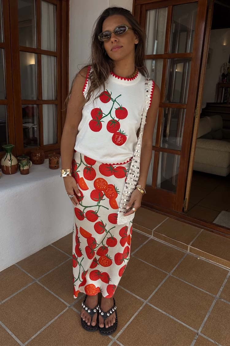 The tomato range brings an element of fun to your summer wardrobe! This super soft, lightweight knit vest is perfect for layering over other elements and adds an extra touch of texture to your outfit. The embroidered tomato print and scallop edge trim brings a pop of colour to the cream base.